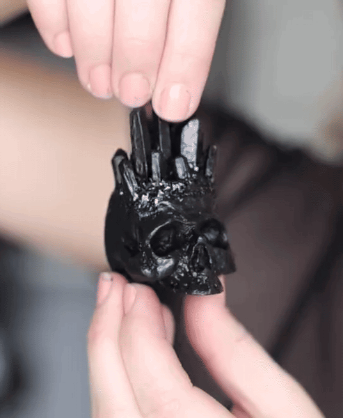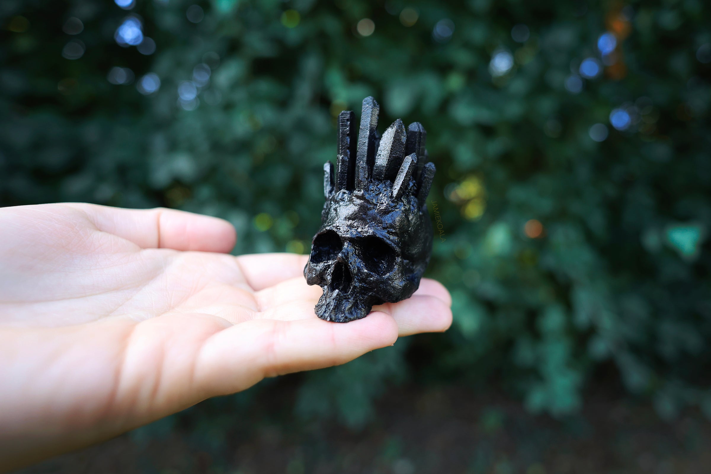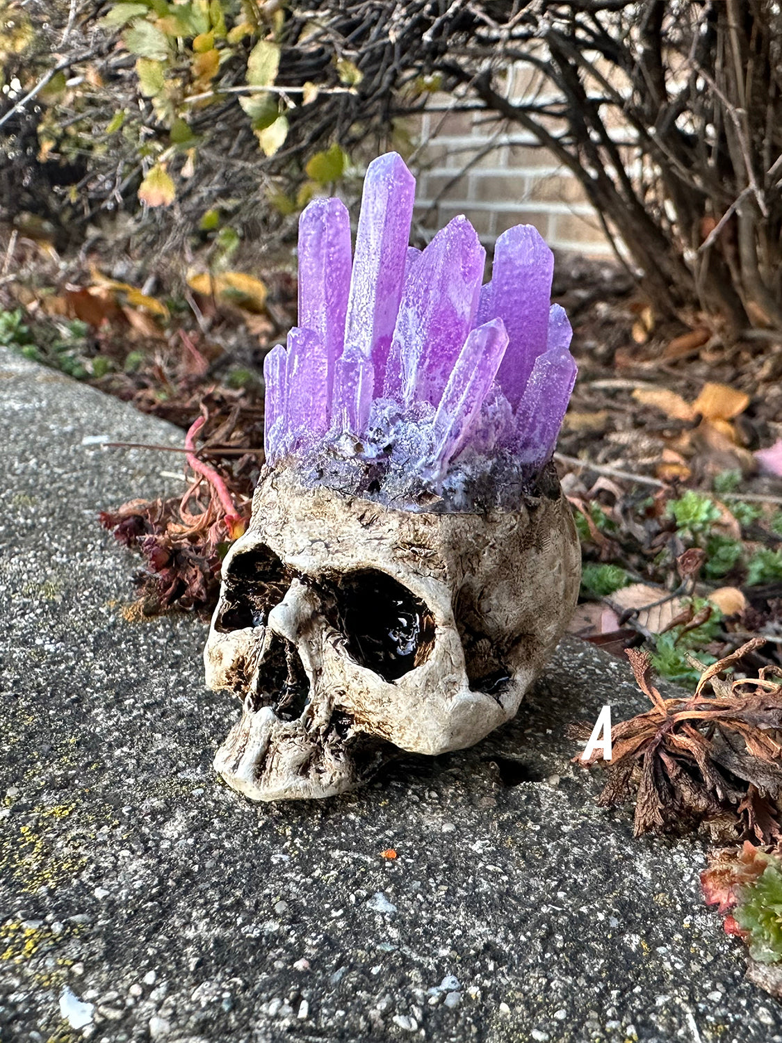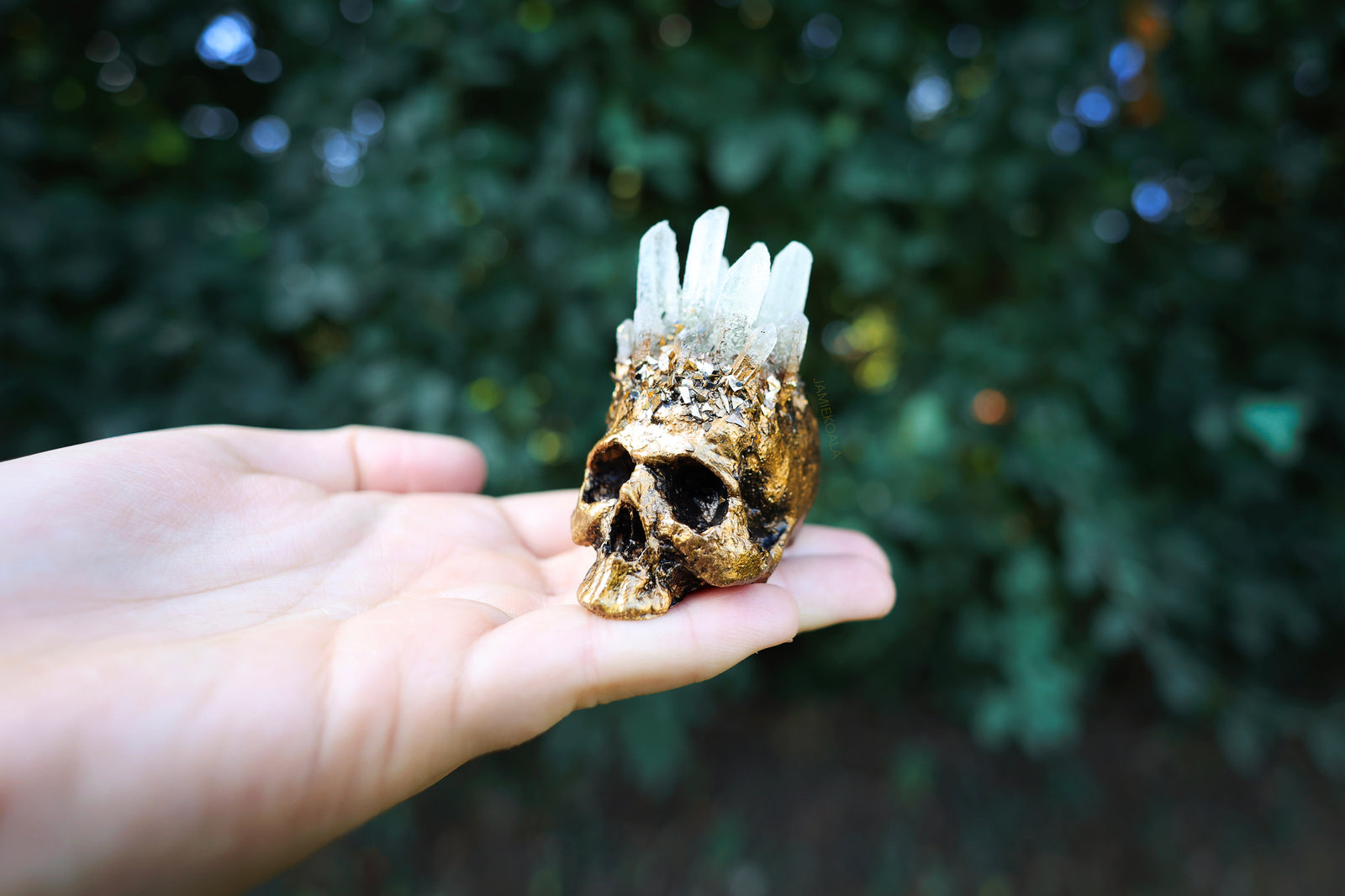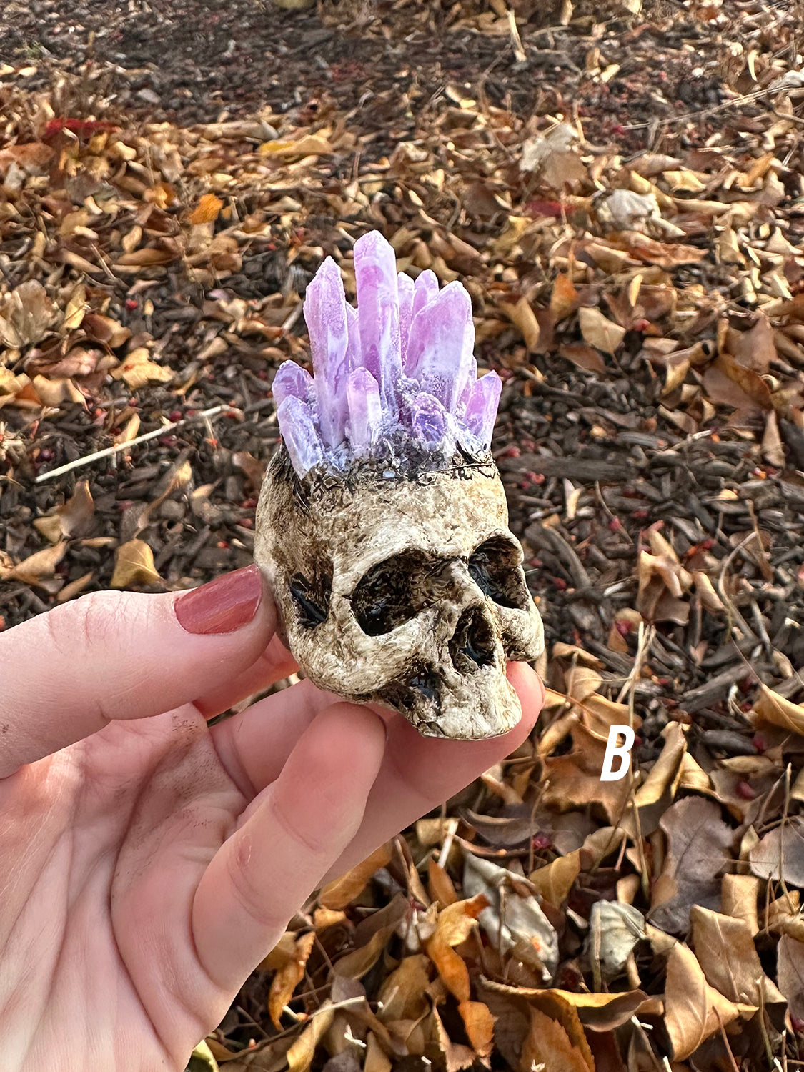 This Skull sculpture is an original piece handmade by Jamie Koala. Each Skull is a faux skull and crystals with unique hand painted detailing and coloring. The pieces measure height 6.6cm, width 4cm and depth 5.5cm; weight 2oz. Because every piece is hand painted and handmade pieces have slight variation in color.