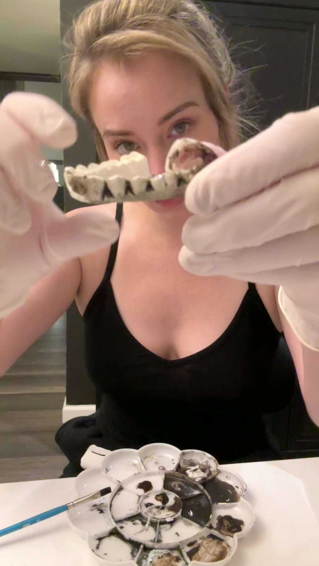 The Conversation Starter Necklace is a quirky piece; whether the story is how you were once in the mob, great grandmas teeth or something of your own imagination this piece is bound to be the life of the party. This piece features a life size hand painted bottom row of teeth hand casted in acrylic on a 16 inch silver chain.